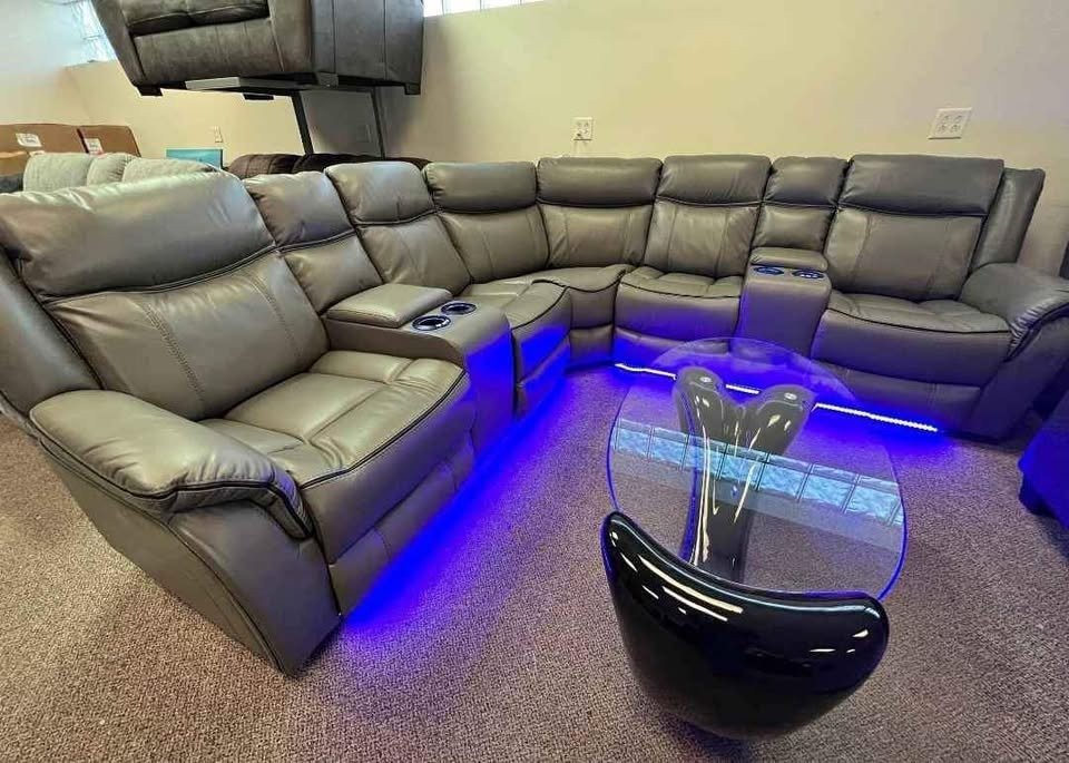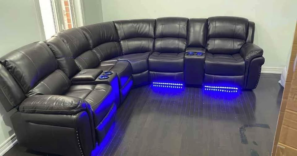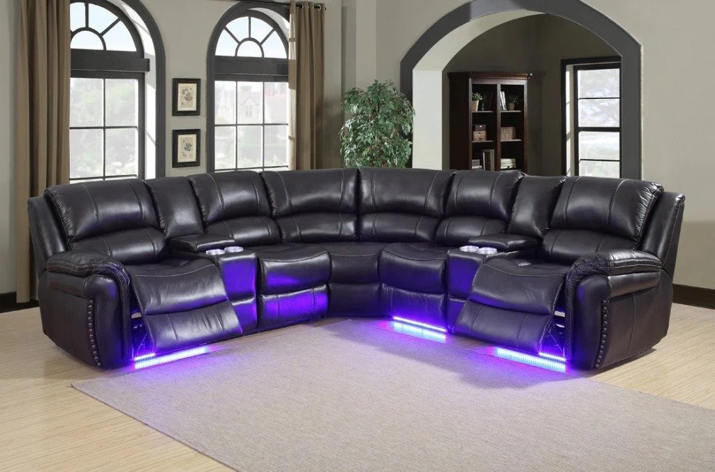 This power reclining sectional is made with soft black leather that looks modern and feels comfortable. It comes with smooth electric recliners on multiple seats, so you can lean back with just a button. The built-in LED lights create a cool theatre-style effect, and the cup holders make movie nights easier. It’s a large, durable sectional designed for families who want comfort, style, and convenience in one place.