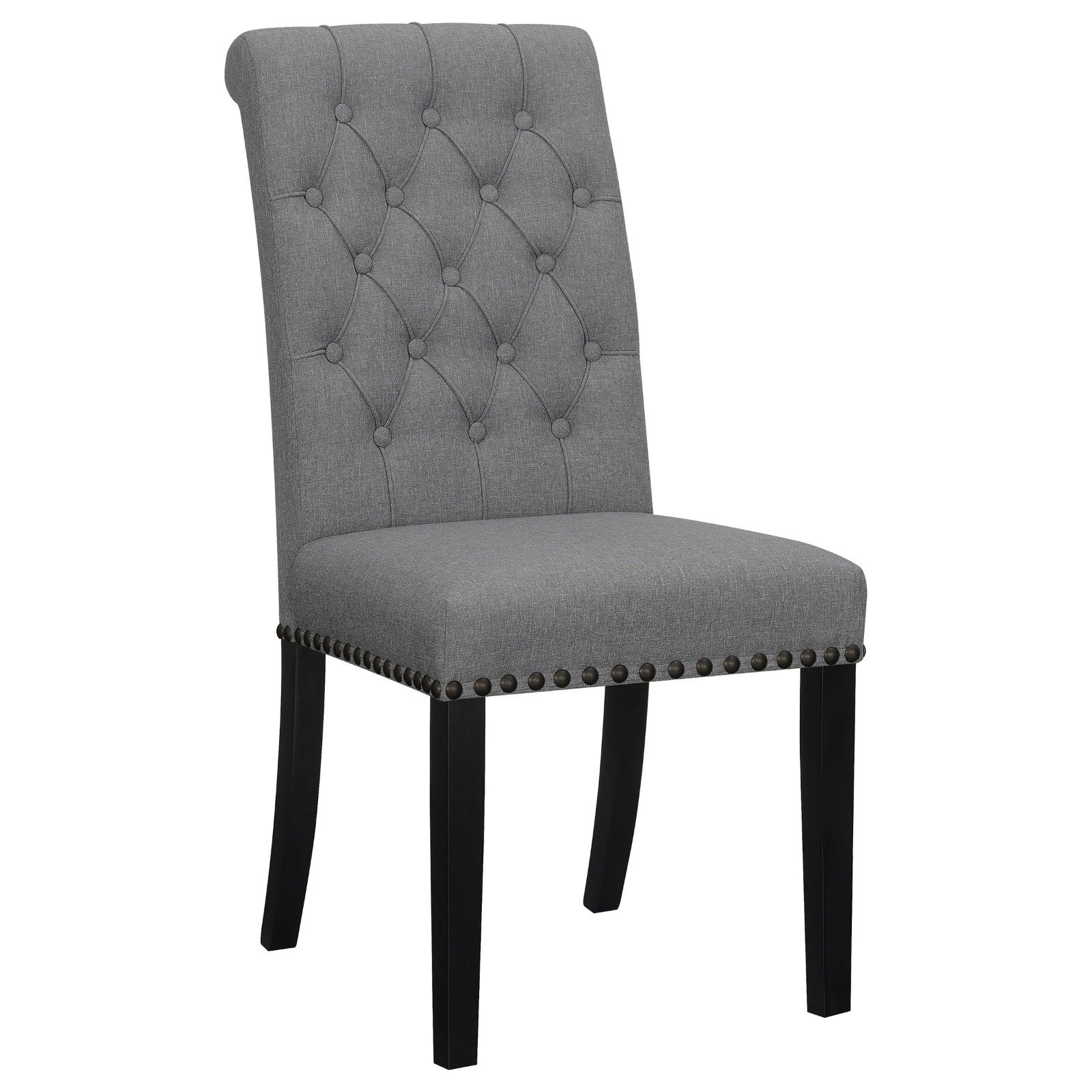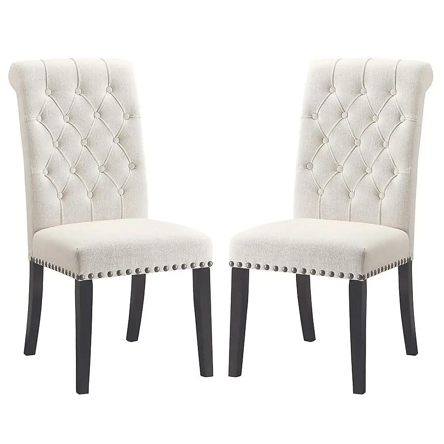 The upholstered dining chair features a timeless tufted back and clean silhouette, adding charm to any dining setup.
