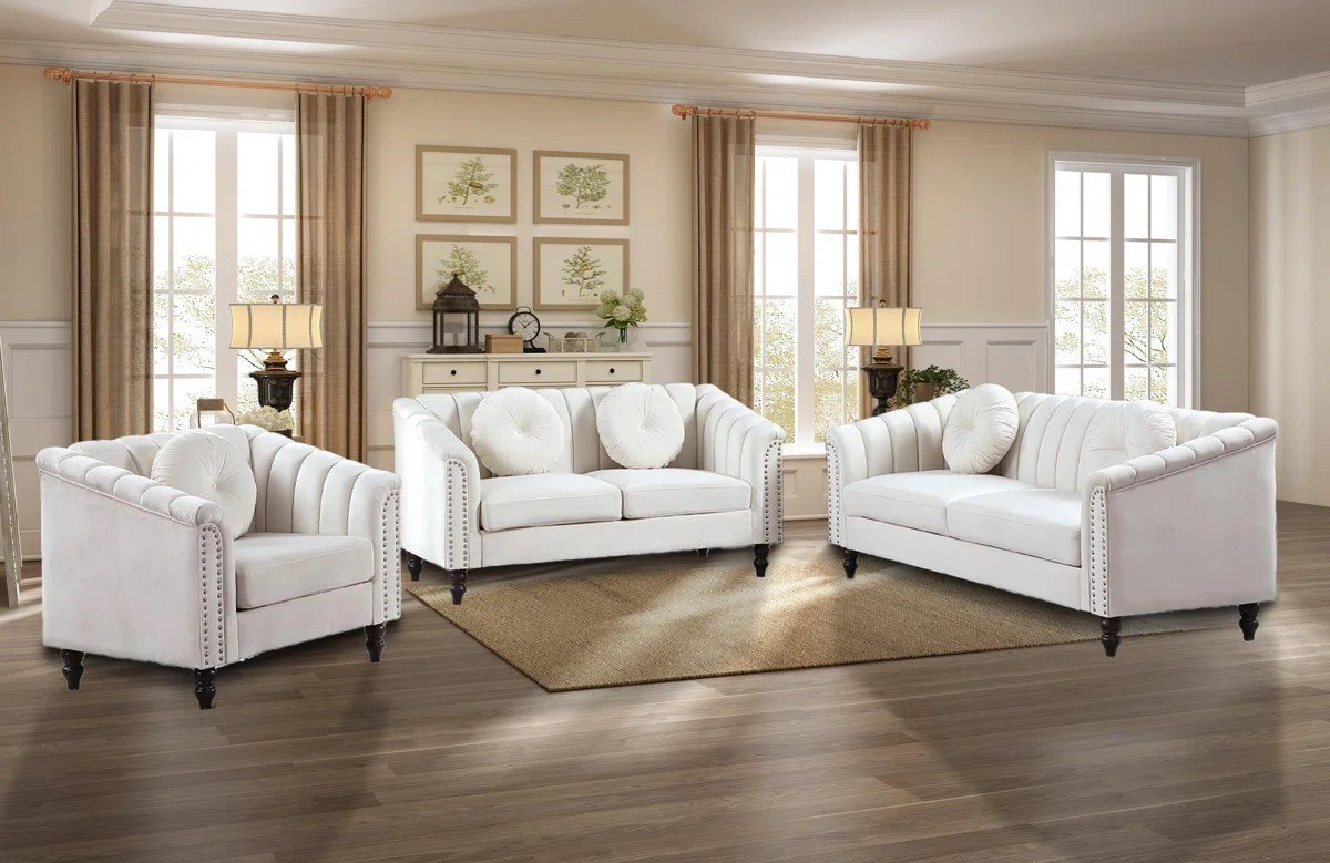 - This 3 piece white sofa set fits beautifully in modern, minimal, or classic décor setups.